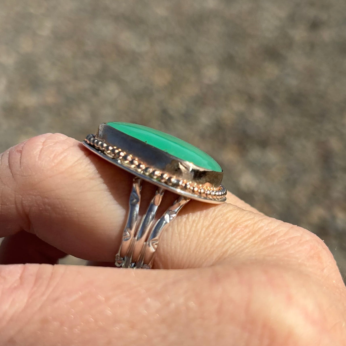 Large green Australian Chrysoprase stone hand fabricated ring, bezel set in 14k gold fill with beaded 14k gold fill detailing around the bezel- set on sterling silver backplate and sterling silver triple ring shank for comfortability. The ring shank is hand stamped.
