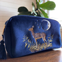 Elevate your beauty routine with our Deer & Moon Embroidered Pouch. Meticulously crafted from Blueberry Velvet with detailed embroidery depicting a fawn gracefully positioned beneath a celestial crescent moon. This pouch proves to be the ideal getaways companion.