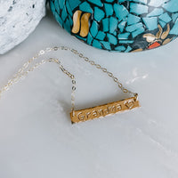 Hand stamped bar necklace with lightly hammered edges and dainty chain is a go to piece for your collection. Multiple options to pick from for stamping.