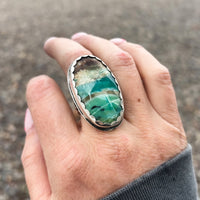 Gorgeous large Opalized Petrified Wood hand fabricated ring, bezel set with scalloped detailing around the bezel and hand stamped detailing on the triple ring shank. Silver has been lightly darkened to give it a patina look.