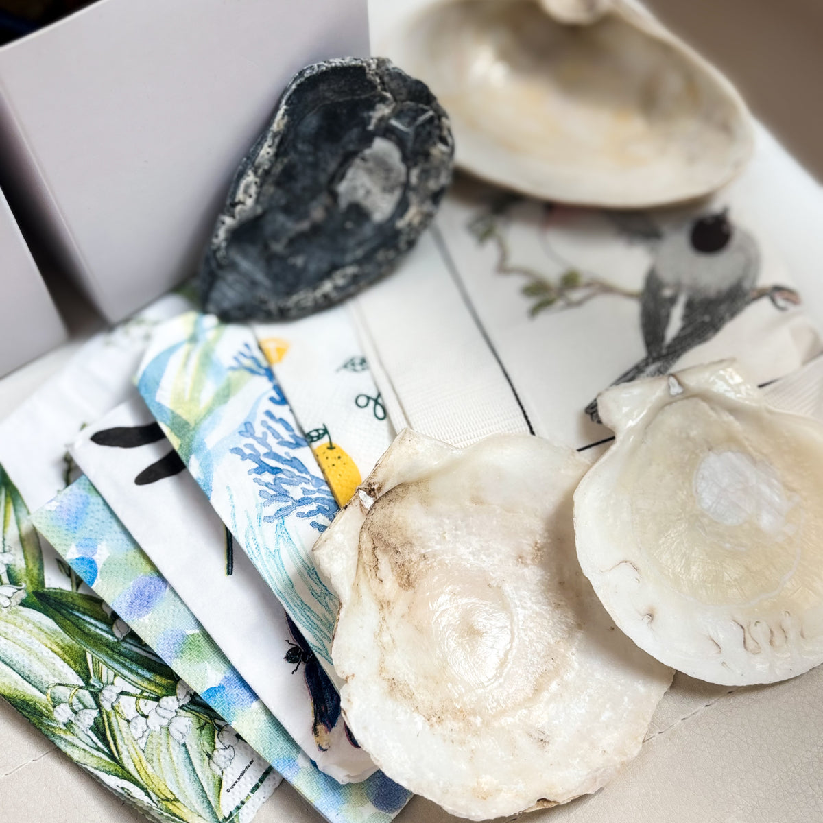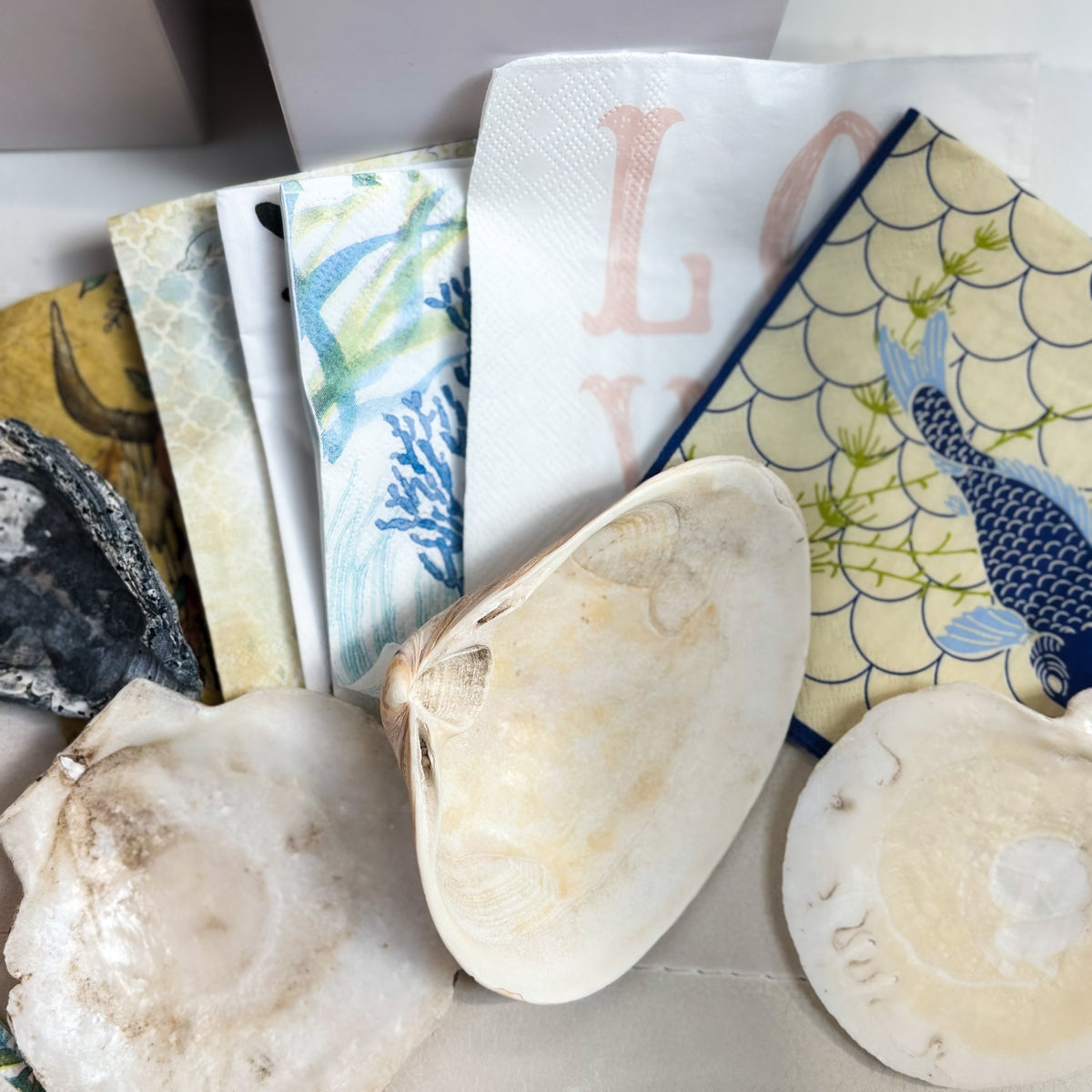 Make your own shell jewelry dishes with this fun DIY decoupage shell kit! It's great for beginners interested in learning the decoupage shell art, and everything you need is included to get started. This also makes a wonderful gift for all ages! Each kit will be packaged in a gift box and includes: 4 shells, sizes vary from 2+ inches and include sea scallop, oyster and clam shell styles that are washed and ready to use.  6 paper napkins (variety picked for each box- what is pictured will not be in all boxes) Mod podge, White paint (primer), Gold paint, Paint brushes as well as step by step Instructions and tips to teach you how to turn beach finds into fun art pieces using decoupage.