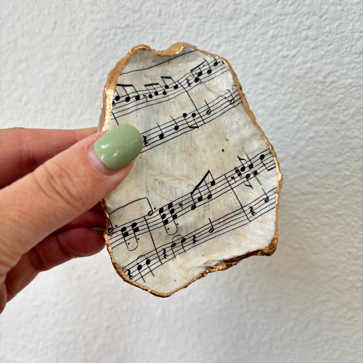 This beautifully designed Jewelry Dish, with its distinctively organic form, is sourced from local fishermen at the Jersey Shore. Each shell is meticulously cleaned, dried, and sorted, before being decorated with recycled napkins.
