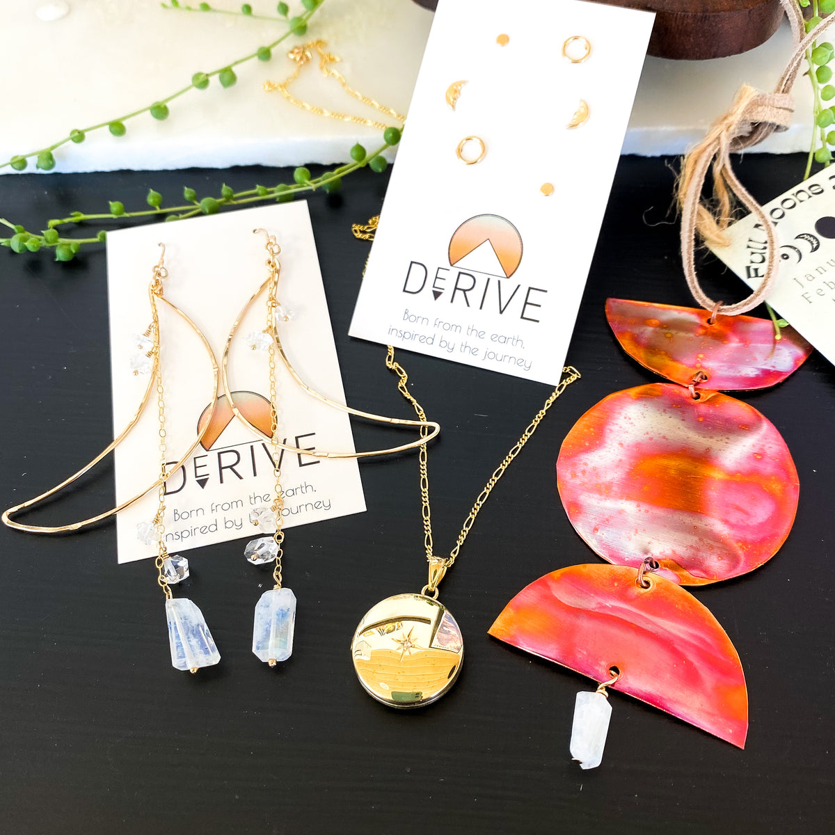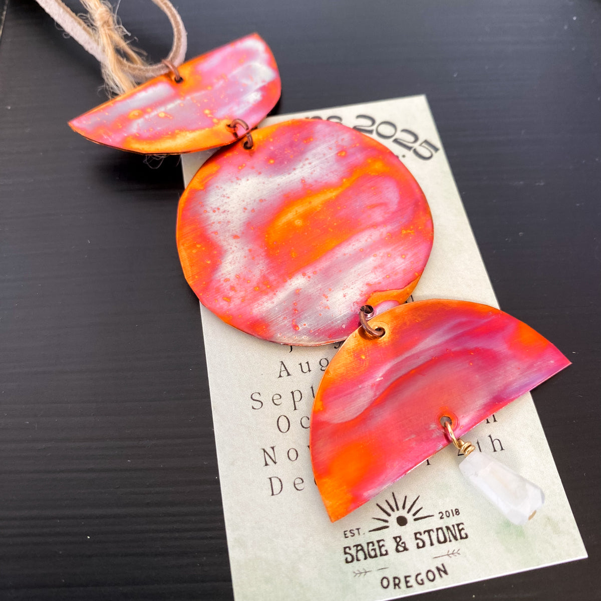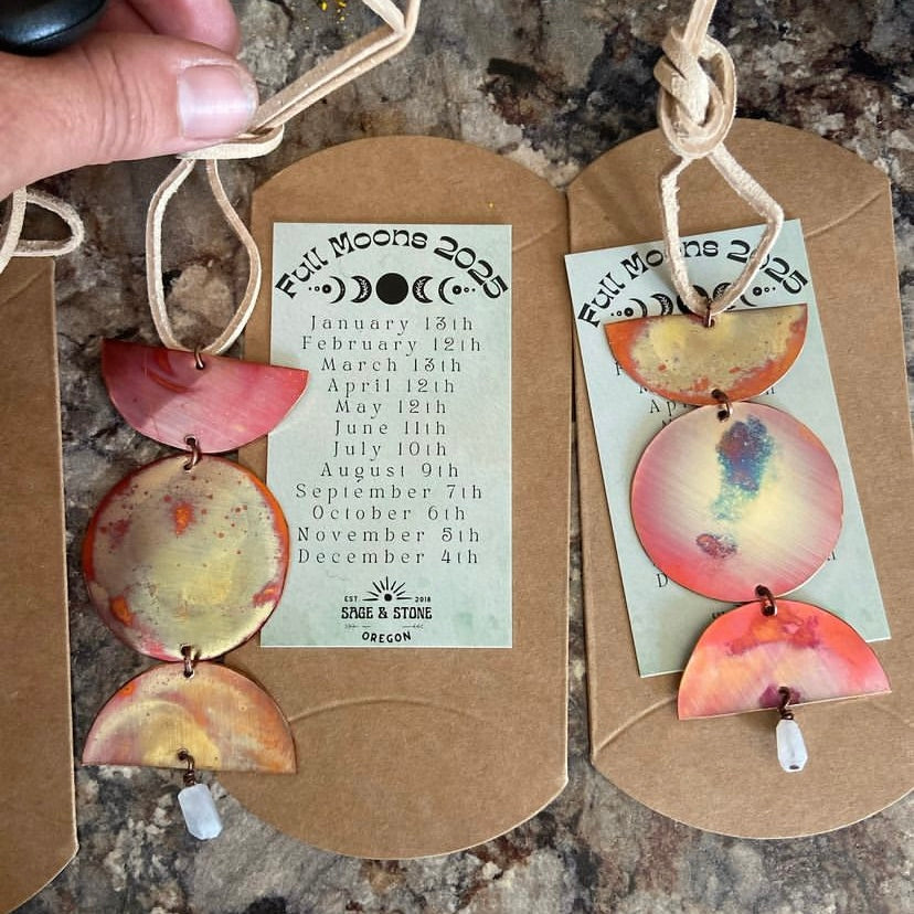 Hand crafted by Brianna with Sage and Stone Creative- these adorable moon phase ornaments feature a moonstone dangle and are patina'ed for a unique individual look. Use as small wall art decor, an ornament… perfect for gifting along with any of our moonstone pieces or our moonphase hand stamped bar necklace!