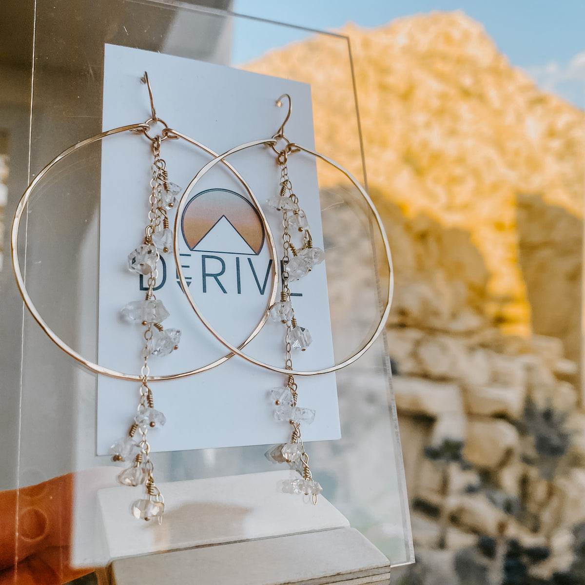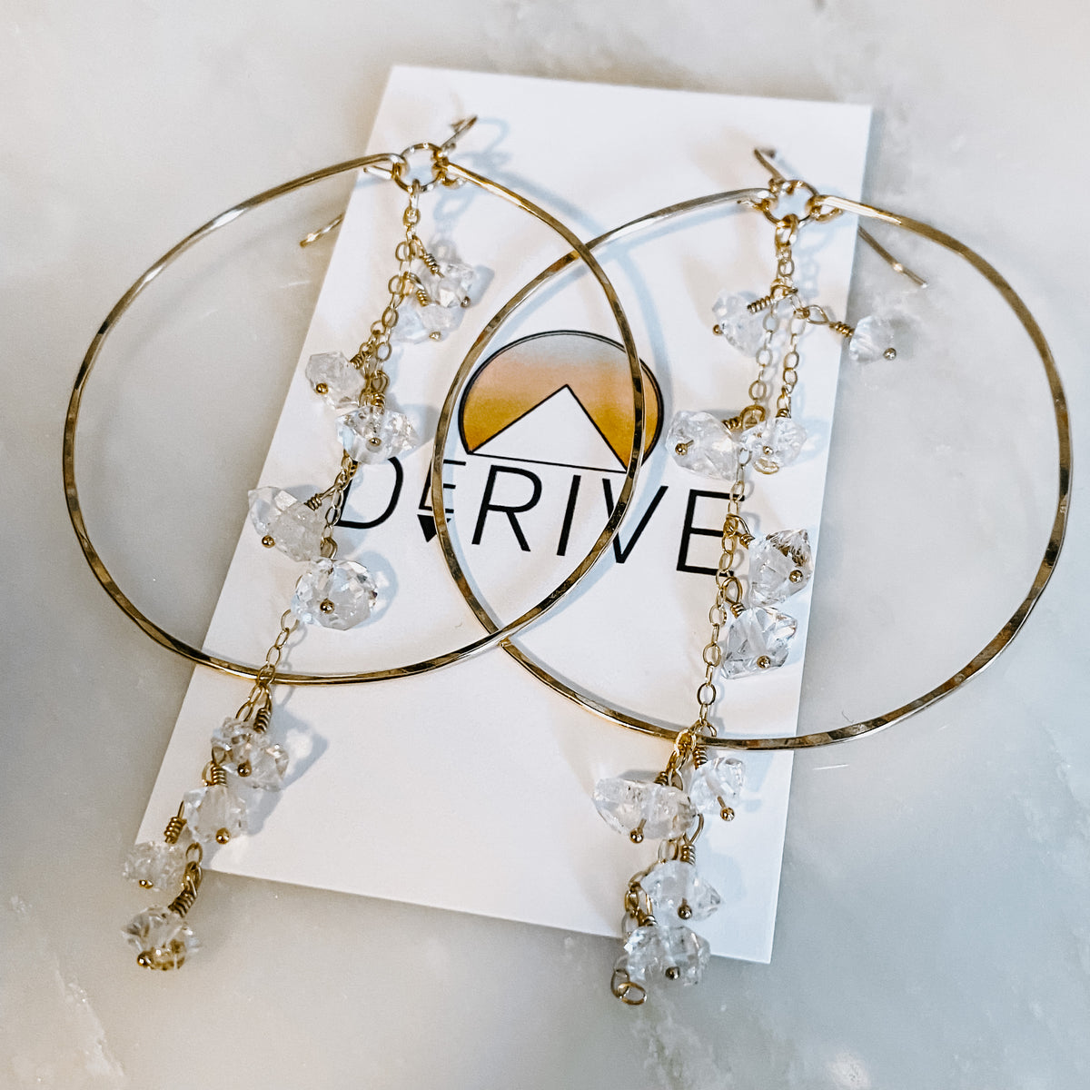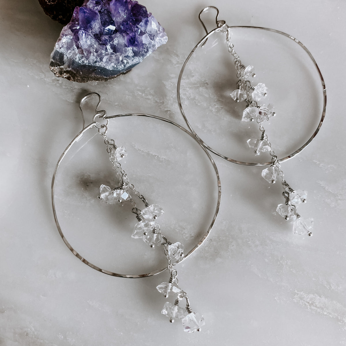 The Enchanted Herkimer Diamond earrings are a beautiful statement piece filled with cascading Herkimer Diamonds that are free flowing. Hand shaped, hammered, textured.