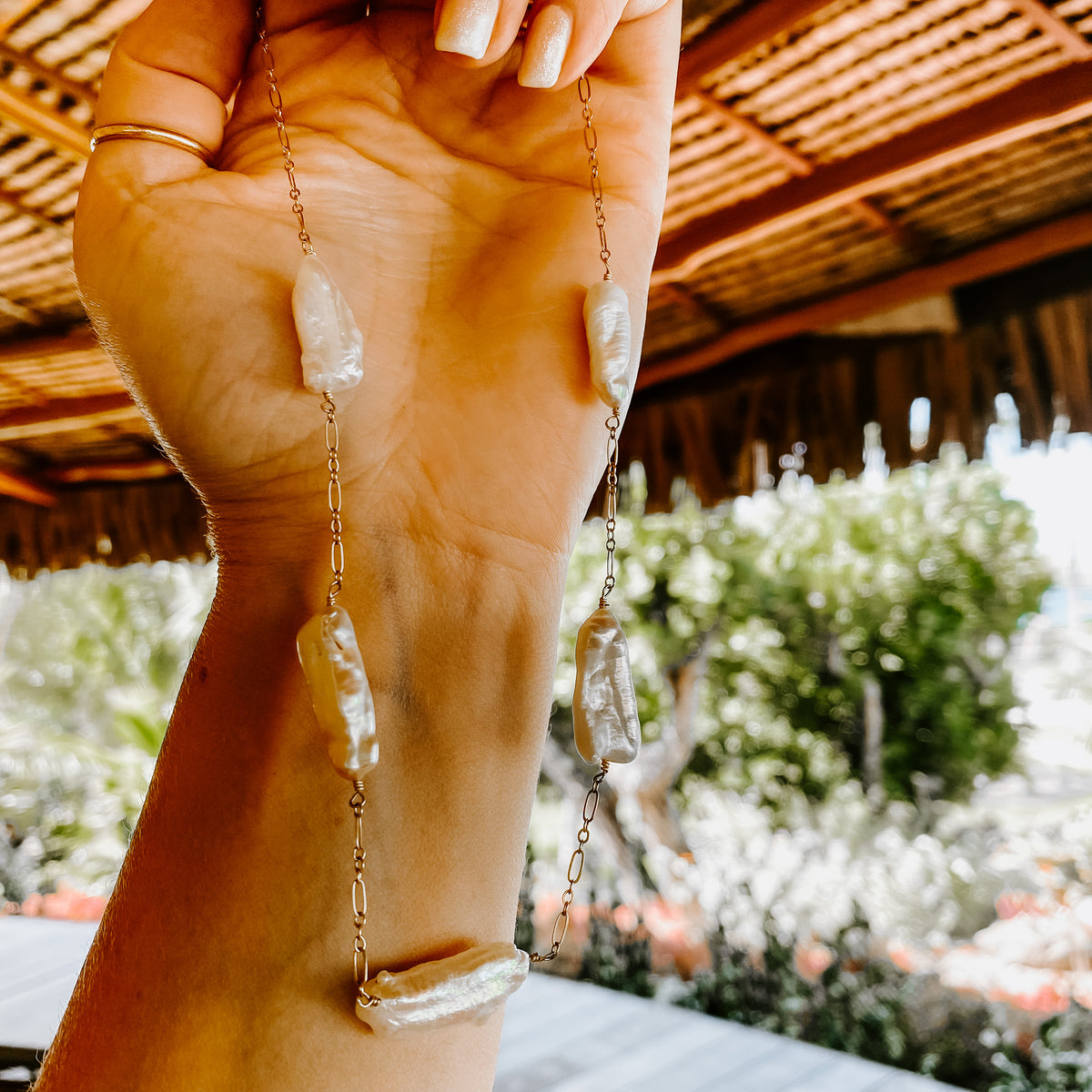 Vacay vibes that can be dressed up while being versatile enough to wear with a plain tee! Five freshwater pearl sticks with mixed link chain. Added adjustability with jump ring connections to make the perfect fit!