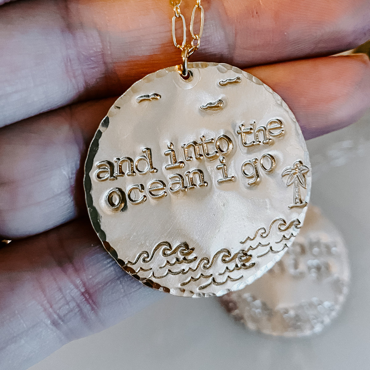 Hand stamped and hammered medallion with the cutest coastal vibe. Perfect for the ocean lover.