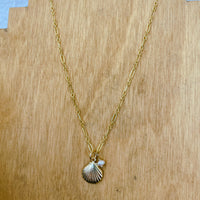 This clam shell pendant necklace is a sweet, dainty and beachy necklace. It also features a tiny freshwater pearl adding to the charm.