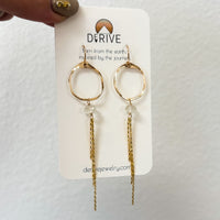 The Origin earrings feature a hand shaped and hammered circle base with a fringe or chain connected by a faceted icy light blue Topaz stone. These are lightweight with fun movement.
