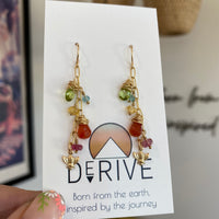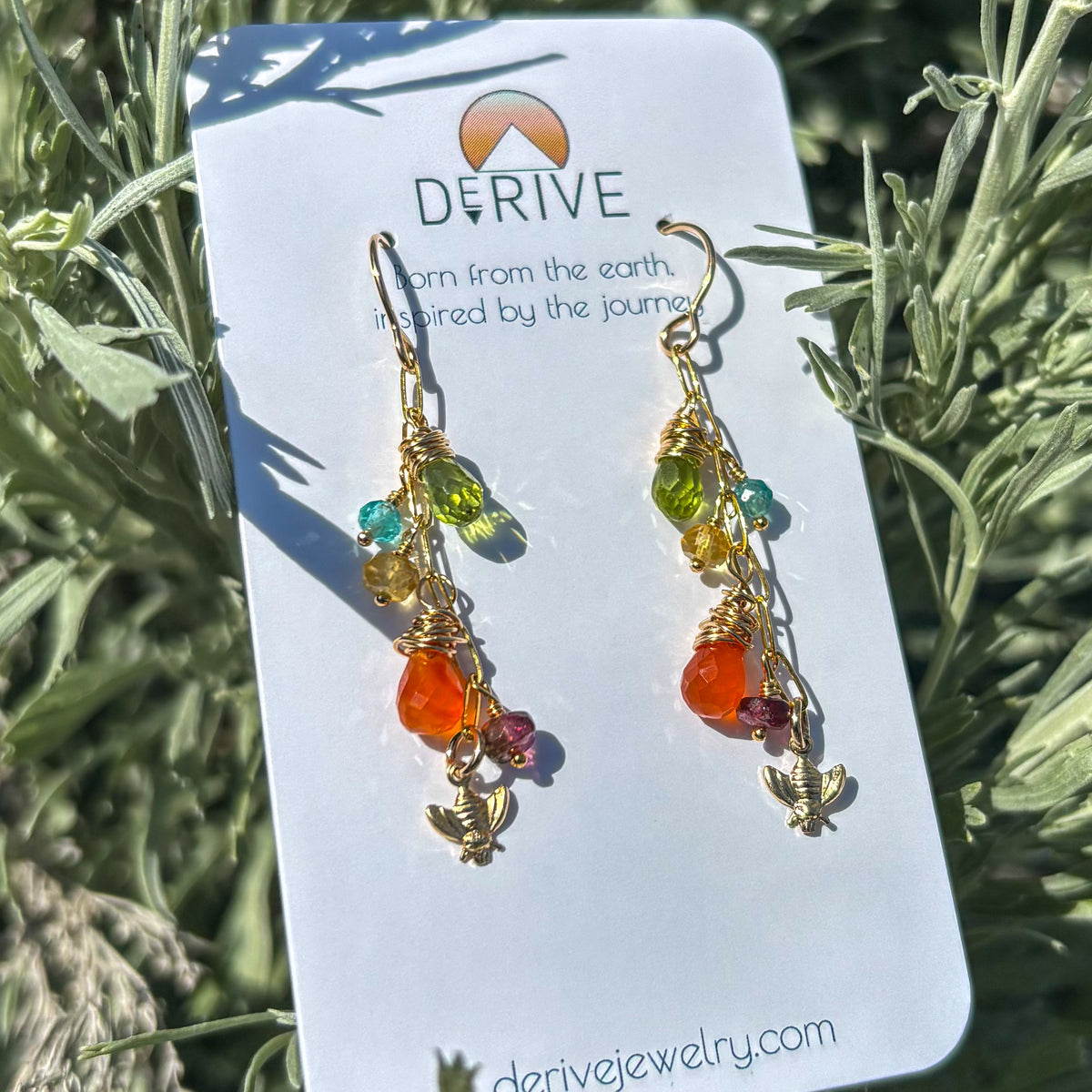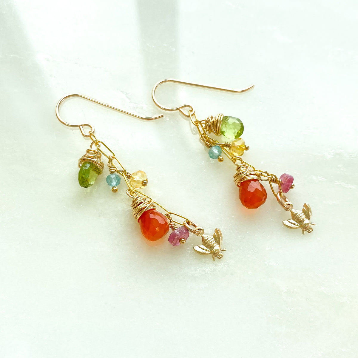 So sweet, these 14k gold fill earrings feature a mix of gems including peridot, carnelian, tourmaline and citrine. To finish off these cute drop earrings is a tiny bee charm.